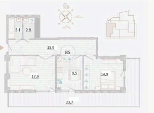 12 этаж, общая площадь - 84 кв.м. Панорамные окна, высота потолков - 3,10 метра.
