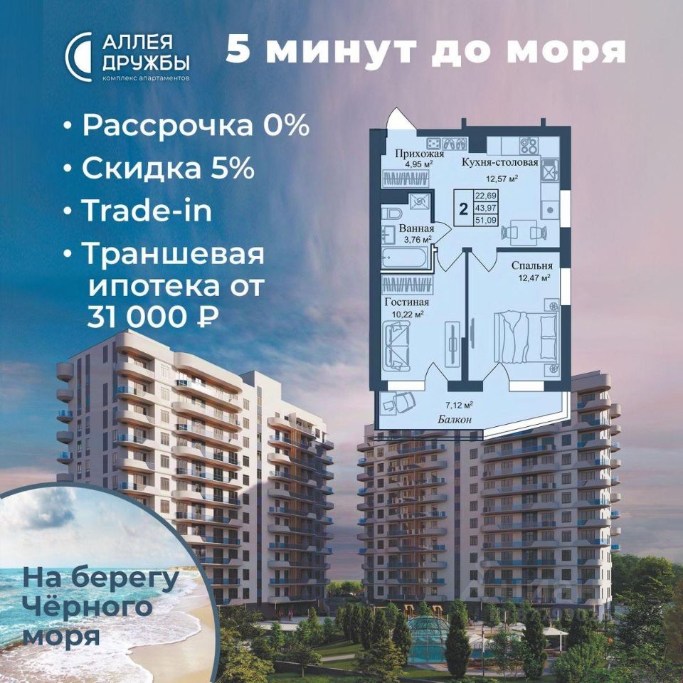 * 5 мин до моря пешком, планировки от 30 кв.м.