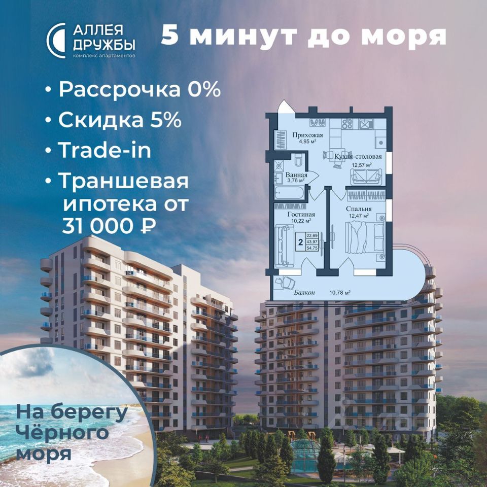 "Аллея Дружбы" — это комплекс апартаментов бизнес-класса в Евпатории, расположенный в 5 минутах прогулки от золотистых пляжей Чёрного моря. Два современных 12-этажных корпуса с панорамными видами на море объединены стильным стилобатом с центральным входом и бутиковыми retail-площадями, а закрытая территория и подземный паркинг обеспечивает приватность и безопасность.
