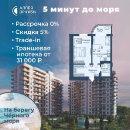 ЗВОНИТЕ ПРЯМО СЕЙЧАС, ЧТОБЫ ПОЛУЧИТЬ ВЫГОДУ ДО 650 000 руб! АКЦИИ: * Ипотека от 14,7% * ТРАНШЕВАЯ ИПОТЕКА - ПВ от 20%, платежи от 31000 в месяц * Рассрочка 0% до 2028г. ПВ от 20% * Скидка 5% * Бронь на 30 дней * 5 мин до моря пешком, планировки от 30 кв.м. * Высота потолков 3 м , предчистовая и чистовая отделка * Ипотека от СБЕРБАНКА * Доходность инвестиций от 30% годовых. * Сдача в аренду от управляющей компании (доверительное управление) позволяет получать доход от сдачи апартаментов без вашего участия * Безопасная сделка по ФЗ-214/эскроу-счёта "Аллея Дружбы" — это комплекс апартаментов бизнес-класса в Евпатории, расположенный в 5 минутах прогулки от золотистых пляжей Чёрного моря. Два современных 12-этажных корпуса с панорамными видами на море объединены стильным стилобатом с центральным входом и бутиковыми retail-площадями, а закрытая территория и подземный паркинг обеспечивает приватность и безопасность. АРХИТЕКТУРА И КОНСТРУКТИВНЫЕ ОСОБЕННОСТИ: • 12-этажное здание в авторском архитектурном стиле • Высота потолков (от 2,9 м до 3,1 м) • Эксклюзивное решение для первых этажей (высота потолков 3,4м) • Евро планировки с террасами и гардеробными • Панорамное ламинированное остекление • Индивидуальные келлеры • Видовые лоты на море • Высокоскоростные лифты по концепции 5* отеля • Предусмотрено резервное электроснабжение • По проекту предусмотрено место для кондиционера и практическое решение для маскировки коммуникаций ЛОКАЦИЯ И ОКРУЖЕНИЕ: • До центра Евпатории - 7 минут на машине • Пляж - всего 5 минут пешком • Рядом с комплексом развитая инфраструктура (рестораны, магазины, кафе, медицинские учреждения, санатории) ГОСТЕПРИИМСТВО И БЕЗУПРЕЧНЫЕ СЕРВИСЫ: • Управляющая компания премиум-класса • Консъерж-сервис 24/7 • Доставки продуктов и готовой еды • Зона ресепшн оформлена в стилистике комплекса • Лобби с атмосферным кафе и зонами для чтения • Премиальное решение для мест общего пользования • Интерактивная детская комната для самых маленьких • Пункты выдачи товаров от маркетплейсов • Гостевые парковочные места • Организовано место для хранения колясок ваших малышей • Ремонт на выбор "Комфорт-формат" и "Гранд-формат" БЕЗОПАСНОСТЬ И ТЕХНОЛОГИИ СПОКОЙСТВИЯ: • Закрытая территория, двор без машин • Система контроля доступа (строго по электронным пропускам) • Подземный паркинг с тремя типами машиномест • Выделенные места для велосипедов • Камеры видеонаблюдения • Круглосуточный ресепшн • Телеметрия - автоматический сбор и передача данных с приборов учета апартамента минимизирует ошибки и мошенничество • Система умного апартамента с дистанционным управлением БЛАГОУСТРОЙСТВО ТЕРРИТОРИИ: • Ландшафтный дизайн по проекту (2 334 м² озеленения) • Прогулочные аллеи и зоны отдыха для расслабления и медитации • Коворкинг-зоны с высокоскоростным Wi-Fi для бизнес-переговоров • Детские и спортивные площадки • В апарт-комплексе вас ждут мини-маркет и магазин повседневных товаров • Специальное пространство для курения • Выделенная площадка для