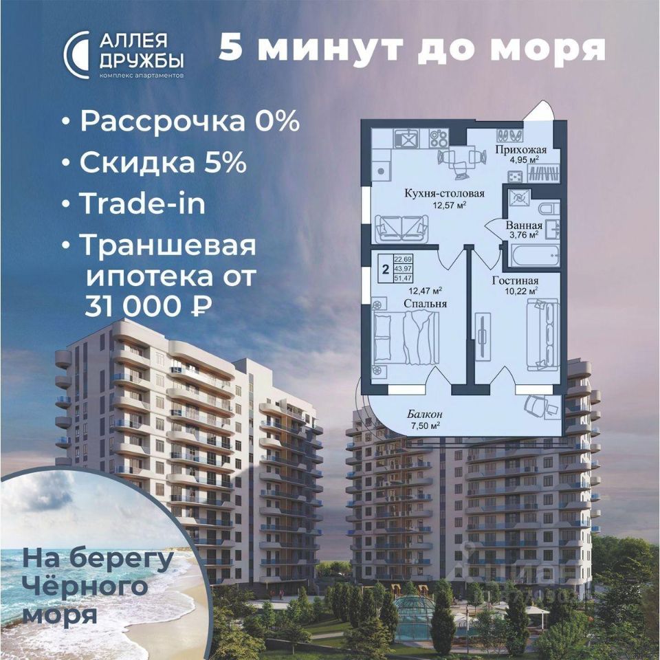 * 5 мин до моря пешком, планировки от 30 кв.м.