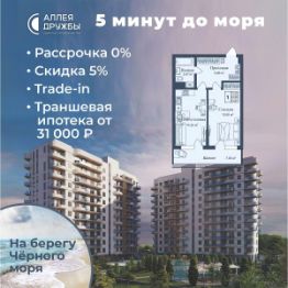 ЗВОНИТЕ ПРЯМО СЕЙЧАС, ЧТОБЫ ПОЛУЧИТЬ ВЫГОДУ ДО 650 000 руб! АКЦИИ: * Ипотека от 14,7% * ТРАНШЕВАЯ ИПОТЕКА - ПВ от 20%, платежи от 31000 в месяц * Рассрочка 0% до 2028г. ПВ от 20% * Скидка 5% * Бронь на 30 дней * 5 мин до моря пешком, планировки от 30 кв.м. * Высота потолков 3 м , предчистовая и чистовая отделка * Ипотека от СБЕРБАНКА * Доходность инвестиций от 30% годовых. * Сдача в аренду от управляющей компании (доверительное управление) позволяет получать доход от сдачи апартаментов без вашего участия * Безопасная сделка по ФЗ-214/эскроу-счёта "Аллея Дружбы" — это комплекс апартаментов бизнес-класса в Евпатории, расположенный в 5 минутах прогулки от золотистых пляжей Чёрного моря. Два современных 12-этажных корпуса с панорамными видами на море объединены стильным стилобатом с центральным входом и бутиковыми retail-площадями, а закрытая территория и подземный паркинг обеспечивает приватность и безопасность. АРХИТЕКТУРА И КОНСТРУКТИВНЫЕ ОСОБЕННОСТИ: • 12-этажное здание в авторском архитектурном стиле • Высота потолков (от 2,9 м до 3,1 м) • Эксклюзивное решение для первых этажей (высота потолков 3,4м) • Евро планировки с террасами и гардеробными • Панорамное ламинированное остекление • Индивидуальные келлеры • Видовые лоты на море • Высокоскоростные лифты по концепции 5* отеля • Предусмотрено резервное электроснабжение • По проекту предусмотрено место для кондиционера и практическое решение для маскировки коммуникаций ЛОКАЦИЯ И ОКРУЖЕНИЕ: • До центра Евпатории - 7 минут на машине • Пляж - всего 5 минут пешком • Рядом с комплексом развитая инфраструктура (рестораны, магазины, кафе, медицинские учреждения, санатории) ГОСТЕПРИИМСТВО И БЕЗУПРЕЧНЫЕ СЕРВИСЫ: • Управляющая компания премиум-класса • Консъерж-сервис 24/7 • Доставки продуктов и готовой еды • Зона ресепшн оформлена в стилистике комплекса • Лобби с атмосферным кафе и зонами для чтения • Премиальное решение для мест общего пользования • Интерактивная детская комната для самых маленьких • Пункты выдачи товаров от маркетплейсов • Гостевые парковочные места • Организовано место для хранения колясок ваших малышей • Ремонт на выбор "Комфорт-формат" и "Гранд-формат" БЕЗОПАСНОСТЬ И ТЕХНОЛОГИИ СПОКОЙСТВИЯ: • Закрытая территория, двор без машин • Система контроля доступа (строго по электронным пропускам) • Подземный паркинг с тремя типами машиномест • Выделенные места для велосипедов • Камеры видеонаблюдения • Круглосуточный ресепшн • Телеметрия - автоматический сбор и передача данных с приборов учета апартамента минимизирует ошибки и мошенничество • Система умного апартамента с дистанционным управлением БЛАГОУСТРОЙСТВО ТЕРРИТОРИИ: • Ландшафтный дизайн по проекту (2 334 м² озеленения) • Прогулочные аллеи и зоны отдыха для расслабления и медитации • Коворкинг-зоны с высокоскоростным Wi-Fi для бизнес-переговоров • Детские и спортивные площадки • В апарт-комплексе вас ждут мини-маркет и магазин повседневных товаров • Специальное пространство для курения • Выделенная площадка для