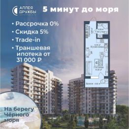 ЗВОНИТЕ ПРЯМО СЕЙЧАС, ЧТОБЫ ПОЛУЧИТЬ ВЫГОДУ ДО 650 000 руб! Цена указана со скидкой 5% при условии 100% оплаты либо ипотека. АКЦИИ: * Ипотека от 14,7% * ТРАНШЕВАЯ ИПОТЕКА - ПВ от 20%, платежи от 31000 в месяц * Рассрочка 0% до 2028г. ПВ от 20% * Скидка 5% * Бронь на 30 дней * 5 мин до моря пешком, планировки от 30 кв.м. * Высота потолков 3 м , предчистовая и чистовая отделка * Ипотека от СБЕРБАНКА * Доходность инвестиций от 30% годовых. * Сдача в аренду от управляющей компании (доверительное управление) позволяет получать доход от сдачи апартаментов без вашего участия * Безопасная сделка по ФЗ-214/эскроу-счёта "Аллея Дружбы" — это комплекс апартаментов бизнес-класса в Евпатории, расположенный в 5 минутах прогулки от золотистых пляжей Чёрного моря. Два современных 12-этажных корпуса с панорамными видами на море объединены стильным стилобатом с центральным входом и бутиковыми retail-площадями, а закрытая территория и подземный паркинг обеспечивает приватность и безопасность. АРХИТЕКТУРА И КОНСТРУКТИВНЫЕ ОСОБЕННОСТИ: • 12-этажное здание в авторском архитектурном стиле • Высота потолков (от 2,9 м до 3,1 м) • Эксклюзивное решение для первых этажей (высота потолков 3,4м) • Евро планировки с террасами и гардеробными • Панорамное ламинированное остекление • Индивидуальные келлеры • Видовые лоты на море • Высокоскоростные лифты по концепции 5* отеля • Предусмотрено резервное электроснабжение • По проекту предусмотрено место для кондиционера и практическое решение для маскировки коммуникаций ЛОКАЦИЯ И ОКРУЖЕНИЕ: • До центра Евпатории - 7 минут на машине • Пляж - всего 5 минут пешком • Рядом с комплексом развитая инфраструктура (рестораны, магазины, кафе, медицинские учреждения, санатории) ГОСТЕПРИИМСТВО И БЕЗУПРЕЧНЫЕ СЕРВИСЫ: • Управляющая компания премиум-класса • Консъерж-сервис 24/7 • Доставки продуктов и готовой еды • Зона ресепшн оформлена в стилистике комплекса • Лобби с атмосферным кафе и зонами для чтения • Премиальное решение для мест общего пользования • Интерактивная детская комната для самых маленьких • Пункты выдачи товаров от маркетплейсов • Гостевые парковочные места • Организовано место для хранения колясок ваших малышей • Ремонт на выбор "Комфорт-формат" и "Гранд-формат" БЕЗОПАСНОСТЬ И ТЕХНОЛОГИИ СПОКОЙСТВИЯ: • Закрытая территория, двор без машин • Система контроля доступа (строго по электронным пропускам) • Подземный паркинг с тремя типами машиномест • Выделенные места для велосипедов • Камеры видеонаблюдения • Круглосуточный ресепшн • Телеметрия - автоматический сбор и передача данных с приборов учета апартамента минимизирует ошибки и мошенничество • Система умного апартамента с дистанционным управлением БЛАГОУСТРОЙСТВО ТЕРРИТОРИИ: • Ландшафтный дизайн по проекту (2 334 м² озеленения) • Прогулочные аллеи и зоны отдыха для расслабления и медитации • Коворкинг-зоны с высокоскоростным Wi-Fi для бизнес-переговоров • Детские и спортивные площадки • В апарт-комплексе вас ждут мини-маркет и магазин повседневных товаров