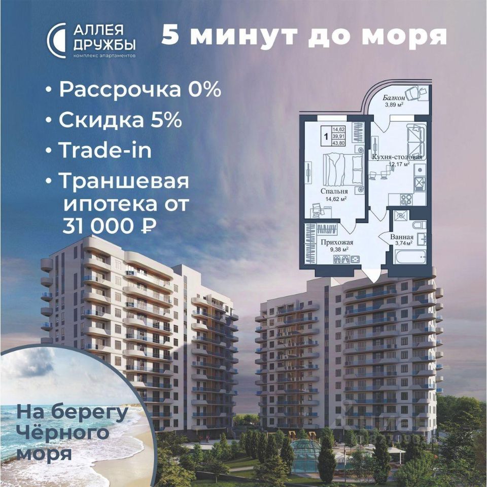 ЗВОНИТЕ ПРЯМО СЕЙЧАС, ЧТОБЫ ПОЛУЧИТЬ ВЫГОДУ ДО 650 000 руб! АКЦИИ: * Ипотека от 14,7% * ТРАНШЕВАЯ ИПОТЕКА - ПВ от 20%, платежи от 31000 в месяц * Рассрочка 0% до 2028г. ПВ от 20% * Скидка 5% * Бронь на 30 дней * 5 мин до моря пешком, планировки от 30 кв.м. * Высота потолков 3 м , предчистовая и чистовая отделка * Ипотека от СБЕРБАНКА * Доходность инвестиций от 30% годовых. * Сдача в аренду от управляющей компании (доверительное управление) позволяет получать доход от сдачи апартаментов без вашего участия * Безопасная сделка по ФЗ-214/эскроу-счёта "Аллея Дружбы" — это комплекс апартаментов бизнес-класса в Евпатории, расположенный в 5 минутах прогулки от золотистых пляжей Чёрного моря. Два современных 12-этажных корпуса с панорамными видами на море объединены стильным стилобатом с центральным входом и бутиковыми retail-площадями, а закрытая территория и подземный паркинг обеспечивает приватность и безопасность. АРХИТЕКТУРА И КОНСТРУКТИВНЫЕ ОСОБЕННОСТИ: • 12-этажное здание в авторском архитектурном стиле • Высота потолков (от 2,9 м до 3,1 м) • Эксклюзивное решение для первых этажей (высота потолков 3,4м) • Евро планировки с террасами и гардеробными • Панорамное ламинированное остекление • Индивидуальные келлеры • Видовые лоты на море • Высокоскоростные лифты по концепции 5* отеля • Предусмотрено резервное электроснабжение • По проекту предусмотрено место для кондиционера и практическое решение для маскировки коммуникаций ЛОКАЦИЯ И ОКРУЖЕНИЕ: • До центра Евпатории - 7 минут на машине • Пляж - всего 5 минут пешком • Рядом с комплексом развитая инфраструктура (рестораны, магазины, кафе, медицинские учреждения, санатории) ГОСТЕПРИИМСТВО И БЕЗУПРЕЧНЫЕ СЕРВИСЫ: • Управляющая компания премиум-класса • Консъерж-сервис 24/7 • Доставки продуктов и готовой еды • Зона ресепшн оформлена в стилистике комплекса • Лобби с атмосферным кафе и зонами для чтения • Премиальное решение для мест общего пользования • Интерактивная детская комната для самых маленьких • Пункты выдачи товаров от маркетплейсов • Гостевые парковочные места • Организовано место для хранения колясок ваших малышей • Ремонт на выбор "Комфорт-формат" и "Гранд-формат" БЕЗОПАСНОСТЬ И ТЕХНОЛОГИИ СПОКОЙСТВИЯ: • Закрытая территория, двор без машин • Система контроля доступа (строго по электронным пропускам) • Подземный паркинг с тремя типами машиномест • Выделенные места для велосипедов • Камеры видеонаблюдения • Круглосуточный ресепшн • Телеметрия - автоматический сбор и передача данных с приборов учета апартамента минимизирует ошибки и мошенничество • Система умного апартамента с дистанционным управлением БЛАГОУСТРОЙСТВО ТЕРРИТОРИИ: • Ландшафтный дизайн по проекту (2 334 м² озеленения) • Прогулочные аллеи и зоны отдыха для расслабления и медитации • Коворкинг-зоны с высокоскоростным Wi-Fi для бизнес-переговоров • Детские и спортивные площадки • В апарт-комплексе вас ждут мини-маркет и магазин повседневных товаров • Специальное пространство для курения • Выделенная площадка для