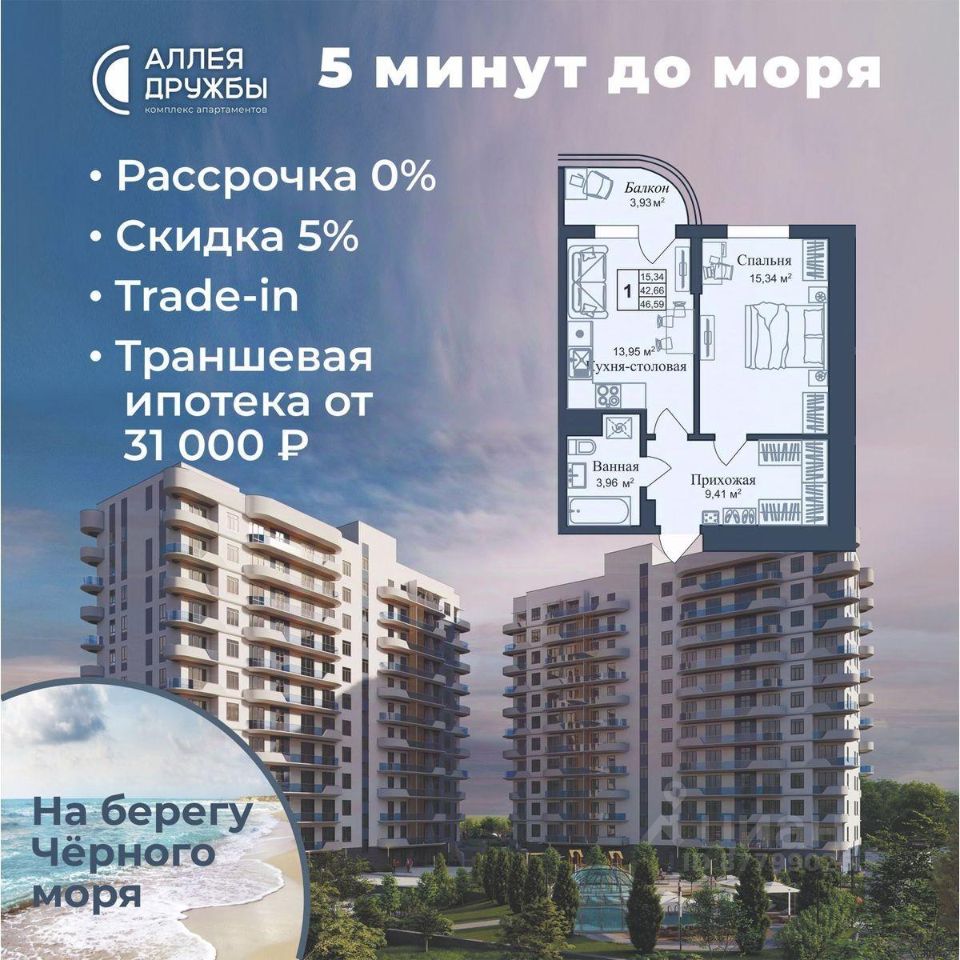 ЗВОНИТЕ ПРЯМО СЕЙЧАС, ЧТОБЫ ПОЛУЧИТЬ ВЫГОДУ ДО 650 000 руб! АКЦИИ: * Ипотека от 14,7% * ТРАНШЕВАЯ ИПОТЕКА - ПВ от 20%, платежи от 31000 в месяц * Рассрочка 0% до 2028г. ПВ от 20% * Скидка 5% * Бронь на 30 дней * 5 мин до моря пешком, планировки от 30 кв.м. * Высота потолков 3 м , предчистовая и чистовая отделка * Ипотека от СБЕРБАНКА * Доходность инвестиций от 30% годовых. * Сдача в аренду от управляющей компании (доверительное управление) позволяет получать доход от сдачи апартаментов без вашего участия * Безопасная сделка по ФЗ-214/эскроу-счёта "Аллея Дружбы" — это комплекс апартаментов бизнес-класса в Евпатории, расположенный в 5 минутах прогулки от золотистых пляжей Чёрного моря. Два современных 12-этажных корпуса с панорамными видами на море объединены стильным стилобатом с центральным входом и бутиковыми retail-площадями, а закрытая территория и подземный паркинг обеспечивает приватность и безопасность. АРХИТЕКТУРА И КОНСТРУКТИВНЫЕ ОСОБЕННОСТИ: • 12-этажное здание в авторском архитектурном стиле • Высота потолков (от 2,9 м до 3,1 м) • Эксклюзивное решение для первых этажей (высота потолков 3,4м) • Евро планировки с террасами и гардеробными • Панорамное ламинированное остекление • Индивидуальные келлеры • Видовые лоты на море • Высокоскоростные лифты по концепции 5* отеля • Предусмотрено резервное электроснабжение • По проекту предусмотрено место для кондиционера и практическое решение для маскировки коммуникаций ЛОКАЦИЯ И ОКРУЖЕНИЕ: • До центра Евпатории - 7 минут на машине • Пляж - всего 5 минут пешком • Рядом с комплексом развитая инфраструктура (рестораны, магазины, кафе, медицинские учреждения, санатории) ГОСТЕПРИИМСТВО И БЕЗУПРЕЧНЫЕ СЕРВИСЫ: • Управляющая компания премиум-класса • Консъерж-сервис 24/7 • Доставки продуктов и готовой еды • Зона ресепшн оформлена в стилистике комплекса • Лобби с атмосферным кафе и зонами для чтения • Премиальное решение для мест общего пользования • Интерактивная детская комната для самых маленьких • Пункты выдачи товаров от маркетплейсов • Гостевые парковочные места • Организовано место для хранения колясок ваших малышей • Ремонт на выбор "Комфорт-формат" и "Гранд-формат" БЕЗОПАСНОСТЬ И ТЕХНОЛОГИИ СПОКОЙСТВИЯ: • Закрытая территория, двор без машин • Система контроля доступа (строго по электронным пропускам) • Подземный паркинг с тремя типами машиномест • Выделенные места для велосипедов • Камеры видеонаблюдения • Круглосуточный ресепшн • Телеметрия - автоматический сбор и передача данных с приборов учета апартамента минимизирует ошибки и мошенничество • Система умного апартамента с дистанционным управлением БЛАГОУСТРОЙСТВО ТЕРРИТОРИИ: • Ландшафтный дизайн по проекту (2 334 м² озеленения) • Прогулочные аллеи и зоны отдыха для расслабления и медитации • Коворкинг-зоны с высокоскоростным Wi-Fi для бизнес-переговоров • Детские и спортивные площадки • В апарт-комплексе вас ждут мини-маркет и магазин повседневных товаров • Специальное пространство для курения • Выделенная площадка для