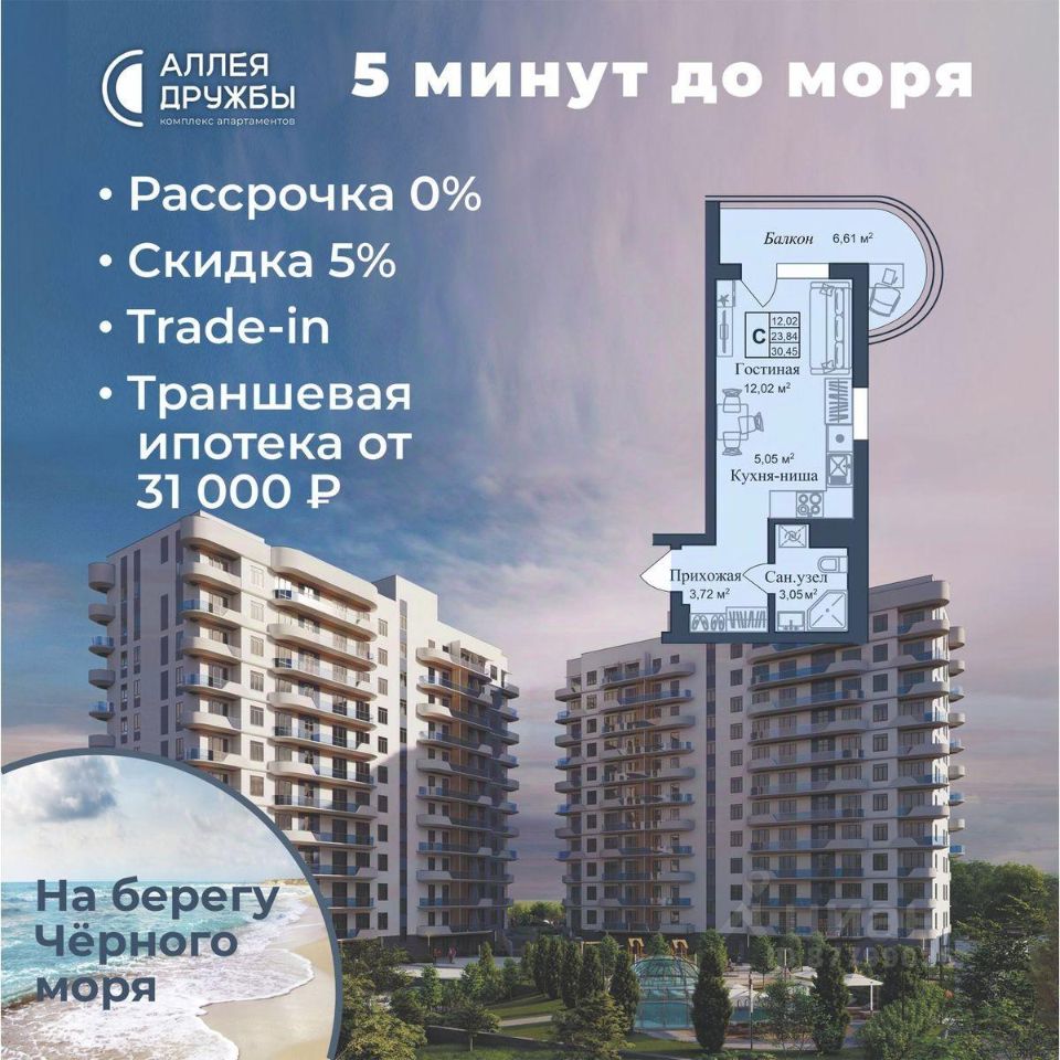 * 5 мин до моря пешком, планировки от 30 кв.м.