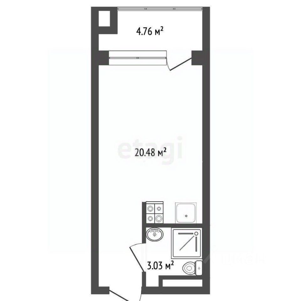 Общая площадь 28,27 кв.м., кухня-гостинная 20.48 кв.м., лоджия- 4.76 кв.м., ,санузел- 3.03 кв.м. Студия в черновой отделке!