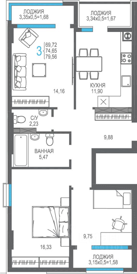 Продаётся 3-комнатная квартира в строящемся доме (Корпус 3), срок сдачи: I-кв. 2026, общей площадью 79.03 кв.м., на 3 этаже. Жилой комплекс "На Фонтанке" в городе Алушта на улице Багликова.