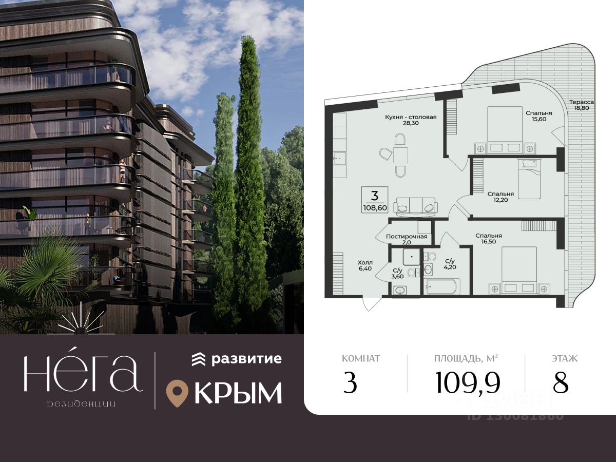 Продается трехкомнатная квартира 44 в новостройке ЖК "Нега" по адресу Республика Крым, Алушта, ул. Глазкрицкого. Общая площадь квартиры - 109.90 кв. м., этаж 8 из 10, секция 3. Тип проекта, по которому построен дом - монолит, компания-застройщик - ООО "ГК "Развитие". Стоимость квартиры - 40425616 Р. Срок сдачи - 3 квартал 2028. Более подробная информация по телефону.