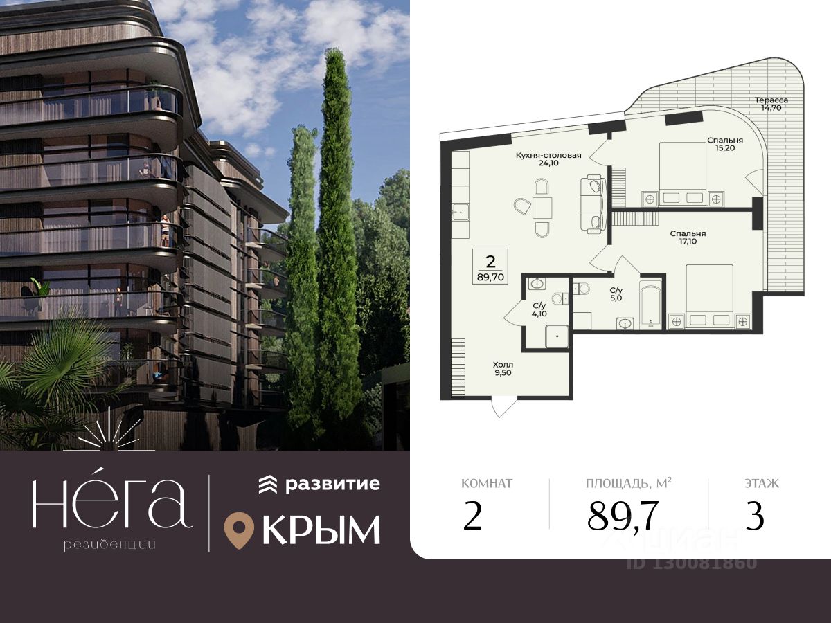 Продается квартира площадью 89.70 кв. м с черновой отделкой. Квартира расположена в премиальном жилом комплексе "Нега", на территории прибрежного города Алушта. Девелопером проекта является федеральный застройщик ГК "Развитие".