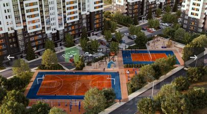 Благоустроенный территория с детскими площадками,спортивными площадками и зонами для прогулок и отдыха.