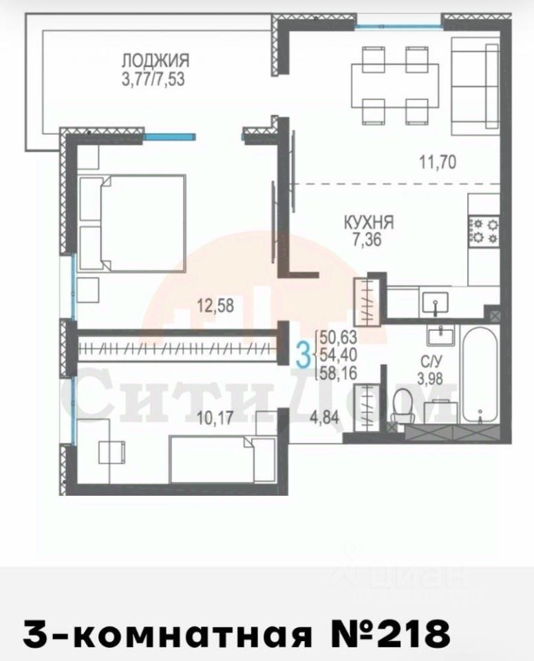 Хороший 3 этаж, три комнаты 12,58, 11,7 и 10,17 кв.м, балкон.