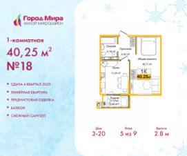 Просторная 1-комн. квартира с предчистовой отделкой в ЖМ "Город Мира" на 5 этаже. Общая площадь: 40.25 кв.м., жилая: 18.71 кв.м., площадь просторной кухни-столовой: 11.24 кв.м. Все окна выходят на одну сторону. В квартире один балкон, один совмещенный санузел. Высота потолков 2.8 м.