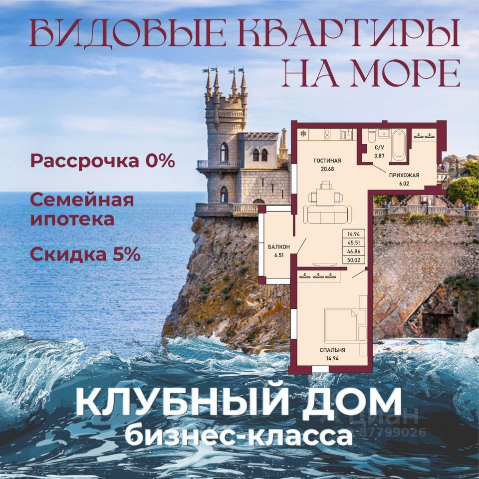 ЗВОНИТЕ ПРЯМО СЕЙЧАС, ЧТОБЫ ЗАБРОНИРОВАТЬ ЛУЧШУЮ КВАРТИРУ! Цена указана со скидкой 5% при условии 100% оплаты либо ипотека. - 80% ВИДОВЫХ КВАРТИРА НА МОРЕ ИЛИ ГОРЫ - Рассрочка 0% - Ипотека от СБЕРБАНКА - Доходность инвестиций от 40% годовых. - Безопасная сделка по ФЗ-214/эскроу-счёта Клубный дом "Ялта" — это воплощение изысканной жизни, где гармонично сочетаются статусность бизнес-класса, уют курортного отдыха и передовые технологии для комфортного проживания. Этот жилой комплекс создан для тех, кто ценит безупречное качество, безопасность и эстетику в каждой детали. Архитектура и дизайн * Современное монолитное 16-этажное здание * Фасады благородных оттенков: чистый белый, переливы шампань и тёплое золото * Первые этажи комплекса представлены в отделке рустовым камнем * Авторские интерьеры мест общего пользования * В темное время суток здания подчёркивает подсветка Характеристики квартиры и мест общего пользования * 80% лотов — с панорамными видами на море и горы. * Просторные балконы * Вместительные гардеробные и кухни-гостиные * Высокие потолки квартир 2,8 м Инфраструктура для комфортной жизни * Инфинити-бассейн * Ландшафтный дизайн и озеленение придомовой территории комплекса * Скоростные грузопассажирские лифты, соответствующие стандартам 5*-отелей, с прямым доступом в паркинг. * Кафетерий и магазин у дома * Детский веревочный комплекс "Парк-Маугли" * Скалодром * Финская сауна, хамам * На 1 этаже жилого комплекса - лапомойка и гостевой туалет Безопасность и технологии спокойствия * Закрытая территория, контролируемый доступ * Видеонаблюдение по всему периметру комплекса * Электронные домофоны с индивидуальными ключами с доступом * Безбарьерная среда * Подземный паркинг * Келлеры * Зоны хранения для велосипедов, самокатов и колясок * Мотоместа Коммуникации и инженерия * Автономная газовая котельная на крыше * Телеметрия * Класс энергоэффективности жилого комплекса "А+" * Места для кондиционеров и практическое решение для маскировки коммуникаций Расположение и ближайшие пляжи * 2,9 км до моря 10 мин на машине * 2 км от центра Ялты * Пляж Приморский — 30 мин пешком / 10 мин на авто * Пляж Массандровский — 20 мин на машине
