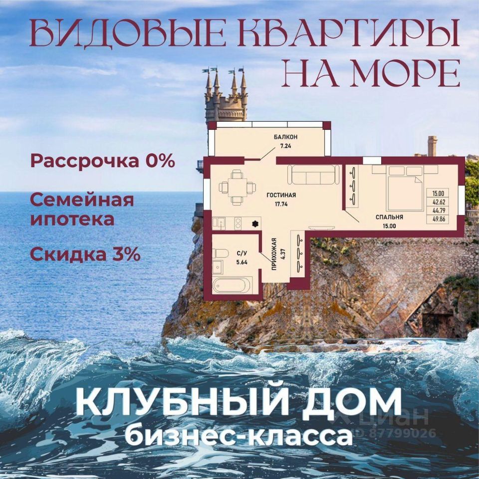 ЗВОНИТЕ ПРЯМО СЕЙЧАС, ЧТОБЫ ЗАБРОНИРОВАТЬ ЛУЧШУЮ КВАРТИРУ! - 80% ВИДОВЫХ КВАРТИРА НА МОРЕ ИЛИ ГОРЫ - Рассрочка 0% - Ипотека от СБЕРБАНКА - Доходность инвестиций от 40% годовых. - Безопасная сделка по ФЗ-214/эскроу-счёта Клубный дом "Ялта" — это воплощение изысканной жизни, где гармонично сочетаются статусность бизнес-класса, уют курортного отдыха и передовые технологии для комфортного проживания. Этот жилой комплекс создан для тех, кто ценит безупречное качество, безопасность и эстетику в каждой детали. Архитектура и дизайн * Современное монолитное 16-этажное здание * Фасады благородных оттенков: чистый белый, переливы шампань и тёплое золото * Первые этажи комплекса представлены в отделке рустовым камнем * Авторские интерьеры мест общего пользования * В темное время суток здания подчёркивает подсветка Характеристики квартиры и мест общего пользования * 80% лотов — с панорамными видами на море и горы. * Просторные балконы * Вместительные гардеробные и кухни-гостиные * Высокие потолки квартир 2,8 м Инфраструктура для комфортной жизни * Инфинити-бассейн * Ландшафтный дизайн и озеленение придомовой территории комплекса * Скоростные грузопассажирские лифты, соответствующие стандартам 5*-отелей, с прямым доступом в паркинг. * Кафетерий и магазин у дома * Детский веревочный комплекс "Парк-Маугли" * Скалодром * Финская сауна, хамам * На 1 этаже жилого комплекса - лапомойка и гостевой туалет Безопасность и технологии спокойствия * Закрытая территория, контролируемый доступ * Видеонаблюдение по всему периметру комплекса * Электронные домофоны с индивидуальными ключами с доступом * Безбарьерная среда * Подземный паркинг * Келлеры * Зоны хранения для велосипедов, самокатов и колясок * Мотоместа Коммуникации и инженерия * Автономная газовая котельная на крыше * Телеметрия * Класс энергоэффективности жилого комплекса "А+" * Места для кондиционеров и практическое решение для маскировки коммуникаций Расположение и ближайшие пляжи * 2,9 км до моря 10 мин на машине * 2 км от центра Ялты * Пляж Приморский — 30 мин пешком / 10 мин на авто * Пляж Массандровский — 20 мин на машине