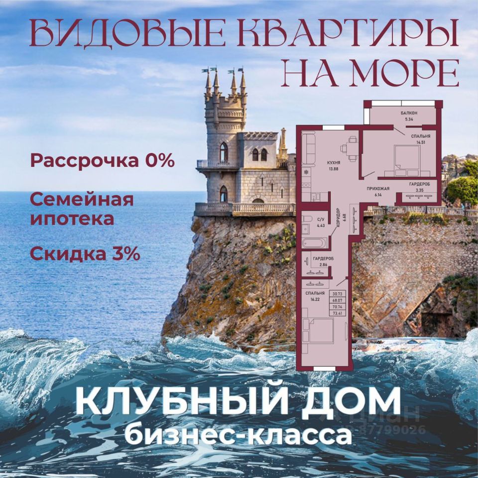 ЗВОНИТЕ ПРЯМО СЕЙЧАС, ЧТОБЫ ЗАБРОНИРОВАТЬ ЛУЧШУЮ КВАРТИРУ! - 80% ВИДОВЫХ КВАРТИРА НА МОРЕ ИЛИ ГОРЫ - Рассрочка 0% - Ипотека от СБЕРБАНКА - Доходность инвестиций от 40% годовых. - Безопасная сделка по ФЗ-214/эскроу-счёта Клубный дом "Ялта" — это воплощение изысканной жизни, где гармонично сочетаются статусность бизнес-класса, уют курортного отдыха и передовые технологии для комфортного проживания. Этот жилой комплекс создан для тех, кто ценит безупречное качество, безопасность и эстетику в каждой детали. Архитектура и дизайн * Современное монолитное 16-этажное здание * Фасады благородных оттенков: чистый белый, переливы шампань и тёплое золото * Первые этажи комплекса представлены в отделке рустовым камнем * Авторские интерьеры мест общего пользования * В темное время суток здания подчёркивает подсветка Характеристики квартиры и мест общего пользования * 80% лотов — с панорамными видами на море и горы. * Просторные балконы * Вместительные гардеробные и кухни-гостиные * Высокие потолки квартир 2,8 м Инфраструктура для комфортной жизни * Инфинити-бассейн * Ландшафтный дизайн и озеленение придомовой территории комплекса * Скоростные грузопассажирские лифты, соответствующие стандартам 5*-отелей, с прямым доступом в паркинг. * Кафетерий и магазин у дома * Детский веревочный комплекс "Парк-Маугли" * Скалодром * Финская сауна, хамам * На 1 этаже жилого комплекса - лапомойка и гостевой туалет Безопасность и технологии спокойствия * Закрытая территория, контролируемый доступ * Видеонаблюдение по всему периметру комплекса * Электронные домофоны с индивидуальными ключами с доступом * Безбарьерная среда * Подземный паркинг * Келлеры * Зоны хранения для велосипедов, самокатов и колясок * Мотоместа Коммуникации и инженерия * Автономная газовая котельная на крыше * Телеметрия * Класс энергоэффективности жилого комплекса "А+" * Места для кондиционеров и практическое решение для маскировки коммуникаций Расположение и ближайшие пляжи * 2,9 км до моря 10 мин на машине * 2 км от центра Ялты * Пляж Приморский — 30 мин пешком / 10 мин на авто * Пляж Массандровский — 20 мин на машине
