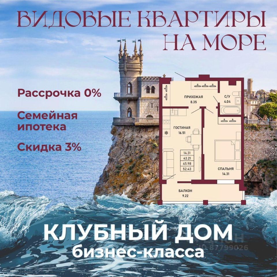 ЗВОНИТЕ ПРЯМО СЕЙЧАС, ЧТОБЫ ЗАБРОНИРОВАТЬ ЛУЧШУЮ КВАРТИРУ! - 80% ВИДОВЫХ КВАРТИРА НА МОРЕ ИЛИ ГОРЫ - Рассрочка 0% - Ипотека от СБЕРБАНКА - Доходность инвестиций от 40% годовых. - Безопасная сделка по ФЗ-214/эскроу-счёта Клубный дом "Ялта" — это воплощение изысканной жизни, где гармонично сочетаются статусность бизнес-класса, уют курортного отдыха и передовые технологии для комфортного проживания. Этот жилой комплекс создан для тех, кто ценит безупречное качество, безопасность и эстетику в каждой детали. Архитектура и дизайн * Современное монолитное 16-этажное здание * Фасады благородных оттенков: чистый белый, переливы шампань и тёплое золото * Первые этажи комплекса представлены в отделке рустовым камнем * Авторские интерьеры мест общего пользования * В темное время суток здания подчёркивает подсветка Характеристики квартиры и мест общего пользования * 80% лотов — с панорамными видами на море и горы. * Просторные балконы * Вместительные гардеробные и кухни-гостиные * Высокие потолки квартир 2,8 м Инфраструктура для комфортной жизни * Инфинити-бассейн * Ландшафтный дизайн и озеленение придомовой территории комплекса * Скоростные грузопассажирские лифты, соответствующие стандартам 5*-отелей, с прямым доступом в паркинг. * Кафетерий и магазин у дома * Детский веревочный комплекс "Парк-Маугли" * Скалодром * Финская сауна, хамам * На 1 этаже жилого комплекса - лапомойка и гостевой туалет Безопасность и технологии спокойствия * Закрытая территория, контролируемый доступ * Видеонаблюдение по всему периметру комплекса * Электронные домофоны с индивидуальными ключами с доступом * Безбарьерная среда * Подземный паркинг * Келлеры * Зоны хранения для велосипедов, самокатов и колясок * Мотоместа Коммуникации и инженерия * Автономная газовая котельная на крыше * Телеметрия * Класс энергоэффективности жилого комплекса "А+" * Места для кондиционеров и практическое решение для маскировки коммуникаций Расположение и ближайшие пляжи * 2,9 км до моря 10 мин на машине * 2 км от центра Ялты * Пляж Приморский — 30 мин пешком / 10 мин на авто * Пляж Массандровский — 20 мин на машине