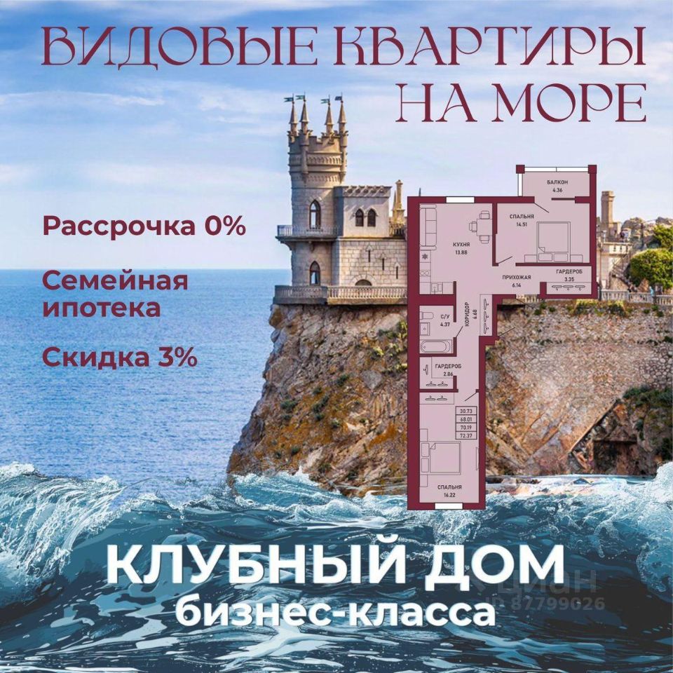 ЗВОНИТЕ ПРЯМО СЕЙЧАС, ЧТОБЫ ЗАБРОНИРОВАТЬ ЛУЧШУЮ КВАРТИРУ! - 80% ВИДОВЫХ КВАРТИРА НА МОРЕ ИЛИ ГОРЫ - Рассрочка 0% - Ипотека от СБЕРБАНКА - Доходность инвестиций от 40% годовых. - Безопасная сделка по ФЗ-214/эскроу-счёта Клубный дом "Ялта" — это воплощение изысканной жизни, где гармонично сочетаются статусность бизнес-класса, уют курортного отдыха и передовые технологии для комфортного проживания. Этот жилой комплекс создан для тех, кто ценит безупречное качество, безопасность и эстетику в каждой детали. Архитектура и дизайн * Современное монолитное 16-этажное здание * Фасады благородных оттенков: чистый белый, переливы шампань и тёплое золото * Первые этажи комплекса представлены в отделке рустовым камнем * Авторские интерьеры мест общего пользования * В темное время суток здания подчёркивает подсветка Характеристики квартиры и мест общего пользования * 80% лотов — с панорамными видами на море и горы. * Просторные балконы * Вместительные гардеробные и кухни-гостиные * Высокие потолки квартир 2,8 м Инфраструктура для комфортной жизни * Инфинити-бассейн * Ландшафтный дизайн и озеленение придомовой территории комплекса * Скоростные грузопассажирские лифты, соответствующие стандартам 5*-отелей, с прямым доступом в паркинг. * Кафетерий и магазин у дома * Детский веревочный комплекс "Парк-Маугли" * Скалодром * Финская сауна, хамам * На 1 этаже жилого комплекса - лапомойка и гостевой туалет Безопасность и технологии спокойствия * Закрытая территория, контролируемый доступ * Видеонаблюдение по всему периметру комплекса * Электронные домофоны с индивидуальными ключами с доступом * Безбарьерная среда * Подземный паркинг * Келлеры * Зоны хранения для велосипедов, самокатов и колясок * Мотоместа Коммуникации и инженерия * Автономная газовая котельная на крыше * Телеметрия * Класс энергоэффективности жилого комплекса "А+" * Места для кондиционеров и практическое решение для маскировки коммуникаций Расположение и ближайшие пляжи * 2,9 км до моря 10 мин на машине * 2 км от центра Ялты * Пляж Приморский — 30 мин пешком / 10 мин на авто * Пляж Массандровский — 20 мин на машине
