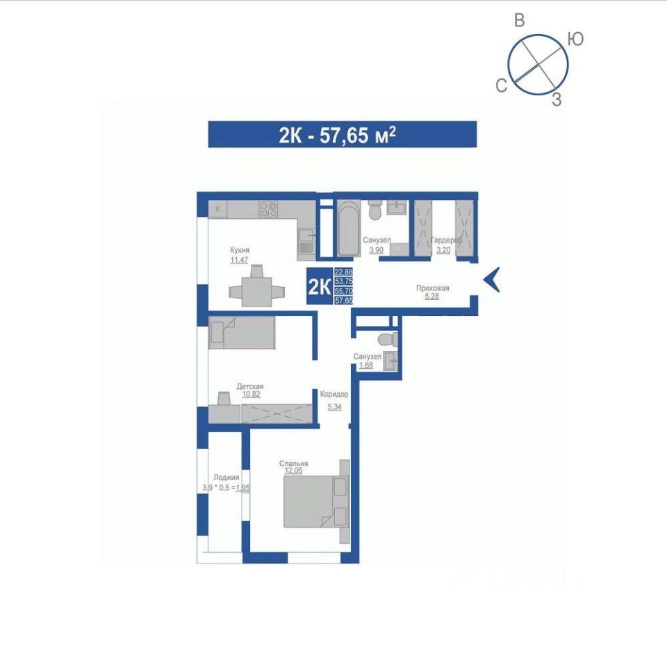 55,7 м²