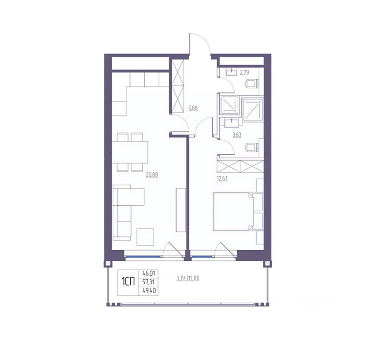 Общая площадь57,31 м²