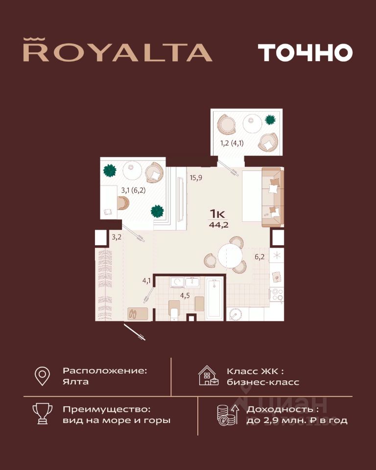 Жилой комплекс "РОЯЛТА" включает 5 монолитно-кирпичных девятиэтажных зданий. Проект предлагает квартиры различных планировок: от однокомнатных до трехкомнатных с расширенными балконами и террасами до 13,4 м2. Территория будет благоустроена детскими игровыми и спортивными площадками, гостевой автостоянкой и озеленением, включая газоны, деревья и кустарники. Также появятся современные уличные тренажёры, СПА-комплекс и панорамный инфинити-бассейн. В шаговой доступности находятся центральная набережная Ялты, детские сады, школы, супермаркеты, торговые центры, Ялтинский медицинский колледж, автовокзал и Мордвиновский парк.