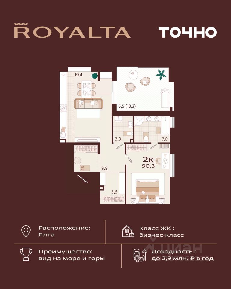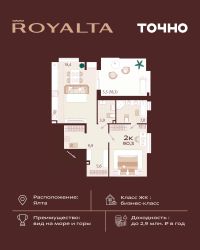 Жилой комплекс "РОЯЛТА" включает 5 монолитно-кирпичных девятиэтажных зданий. Проект предлагает квартиры различных планировок: от однокомнатных до трехкомнатных с расширенными балконами и террасами до 13,4 м2. Территория будет благоустроена детскими игровыми и спортивными площадками, гостевой автостоянкой и озеленением, включая газоны, деревья и кустарники. Также появятся современные уличные тренажёры, СПА-комплекс и панорамный инфинити-бассейн. В шаговой доступности находятся центральная набережная Ялты, детские сады, школы, супермаркеты, торговые центры, Ялтинский медицинский колледж, автовокзал и Мордвиновский парк.