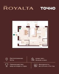 Жилой комплекс "РОЯЛТА" включает 5 монолитно-кирпичных девятиэтажных зданий. Проект предлагает квартиры различных планировок: от однокомнатных до трехкомнатных с расширенными балконами и террасами до 13,4 м2. Территория будет благоустроена детскими игровыми и спортивными площадками, гостевой автостоянкой и озеленением, включая газоны, деревья и кустарники. Также появятся современные уличные тренажёры, СПА-комплекс и панорамный инфинити-бассейн. В шаговой доступности находятся центральная набережная Ялты, детские сады, школы, супермаркеты, торговые центры, Ялтинский медицинский колледж, автовокзал и Мордвиновский парк.