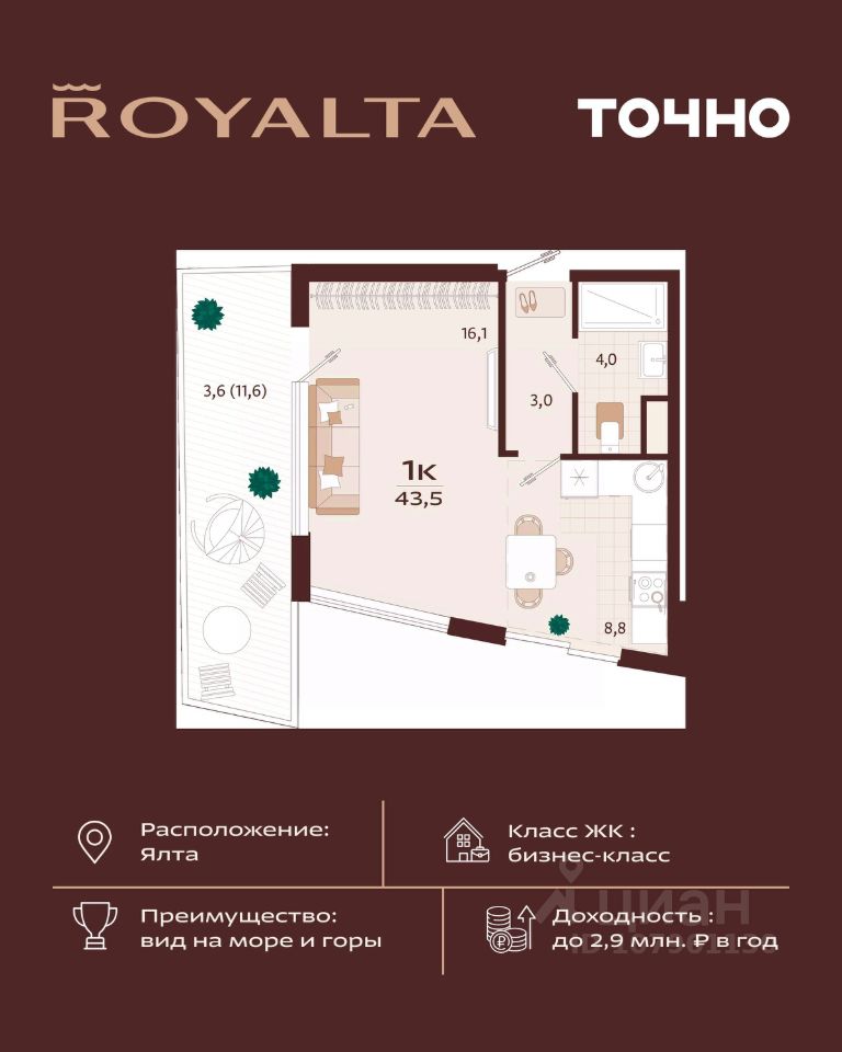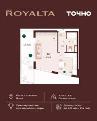 Жилой комплекс "РОЯЛТА" включает 5 монолитно-кирпичных девятиэтажных зданий. Проект предлагает квартиры различных планировок: от однокомнатных до трехкомнатных с расширенными балконами и террасами до 13,4 м2. Территория будет благоустроена детскими игровыми и спортивными площадками, гостевой автостоянкой и озеленением, включая газоны, деревья и кустарники. Также появятся современные уличные тренажёры, СПА-комплекс и панорамный инфинити-бассейн. В шаговой доступности находятся центральная набережная Ялты, детские сады, школы, супермаркеты, торговые центры, Ялтинский медицинский колледж, автовокзал и Мордвиновский парк.