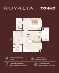 Жилой комплекс "РОЯЛТА" включает 5 монолитно-кирпичных девятиэтажных зданий. Проект предлагает квартиры различных планировок: от однокомнатных до трехкомнатных с расширенными балконами и террасами до 13,4 м2. Территория будет благоустроена детскими игровыми и спортивными площадками, гостевой автостоянкой и озеленением, включая газоны, деревья и кустарники. Также появятся современные уличные тренажёры, СПА-комплекс и панорамный инфинити-бассейн. В шаговой доступности находятся центральная набережная Ялты, детские сады, школы, супермаркеты, торговые центры, Ялтинский медицинский колледж, автовокзал и Мордвиновский парк.