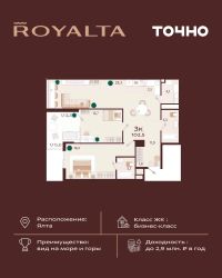 Жилой комплекс "РОЯЛТА" включает 5 монолитно-кирпичных девятиэтажных зданий. Проект предлагает квартиры различных планировок: от однокомнатных до трехкомнатных с расширенными балконами и террасами до 13,4 м2. Территория будет благоустроена детскими игровыми и спортивными площадками, гостевой автостоянкой и озеленением, включая газоны, деревья и кустарники. Также появятся современные уличные тренажёры, СПА-комплекс и панорамный инфинити-бассейн. В шаговой доступности находятся центральная набережная Ялты, детские сады, школы, супермаркеты, торговые центры, Ялтинский медицинский колледж, автовокзал и Мордвиновский парк.
