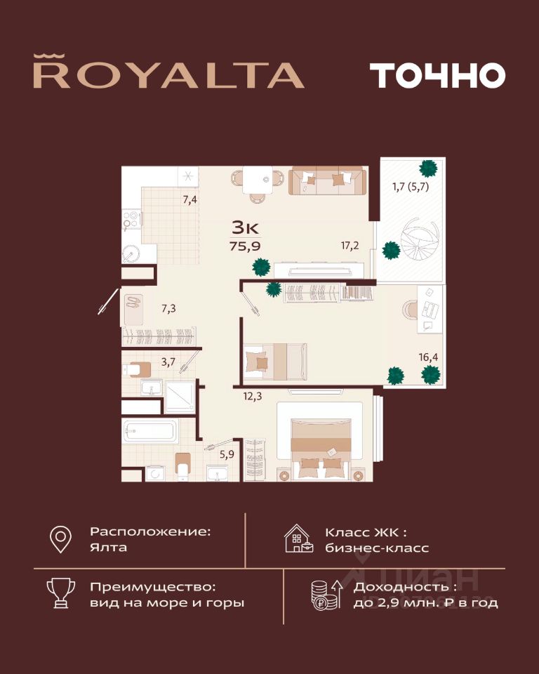 Жилой комплекс "РОЯЛТА" включает 5 монолитно-кирпичных девятиэтажных зданий. Проект предлагает квартиры различных планировок: от однокомнатных до трехкомнатных с расширенными балконами и террасами до 13,4 м2. Территория будет благоустроена детскими игровыми и спортивными площадками, гостевой автостоянкой и озеленением, включая газоны, деревья и кустарники. Также появятся современные уличные тренажёры, СПА-комплекс и панорамный инфинити-бассейн. В шаговой доступности находятся центральная набережная Ялты, детские сады, школы, супермаркеты, торговые центры, Ялтинский медицинский колледж, автовокзал и Мордвиновский парк.