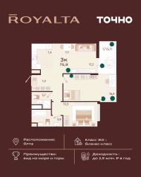 Жилой комплекс "РОЯЛТА" включает 5 монолитно-кирпичных девятиэтажных зданий. Проект предлагает квартиры различных планировок: от однокомнатных до трехкомнатных с расширенными балконами и террасами до 13,4 м2. Территория будет благоустроена детскими игровыми и спортивными площадками, гостевой автостоянкой и озеленением, включая газоны, деревья и кустарники. Также появятся современные уличные тренажёры, СПА-комплекс и панорамный инфинити-бассейн. В шаговой доступности находятся центральная набережная Ялты, детские сады, школы, супермаркеты, торговые центры, Ялтинский медицинский колледж, автовокзал и Мордвиновский парк.