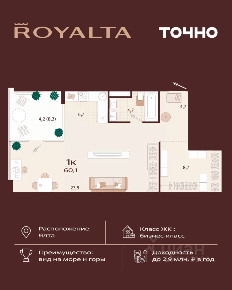 Жилой комплекс "РОЯЛТА" включает 5 монолитно-кирпичных девятиэтажных зданий. Проект предлагает квартиры различных планировок: от однокомнатных до трехкомнатных с расширенными балконами и террасами до 13,4 м2. Территория будет благоустроена детскими игровыми и спортивными площадками, гостевой автостоянкой и озеленением, включая газоны, деревья и кустарники. Также появятся современные уличные тренажёры, СПА-комплекс и панорамный инфинити-бассейн. В шаговой доступности находятся центральная набережная Ялты, детские сады, школы, супермаркеты, торговые центры, Ялтинский медицинский колледж, автовокзал и Мордвиновский парк.