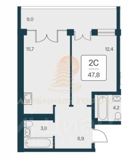 Евродвушка 47,8 кв.м. Кухня-гостиная 15,7 кв.м. Спальная 12,4 кв.м. Отделка White Box.