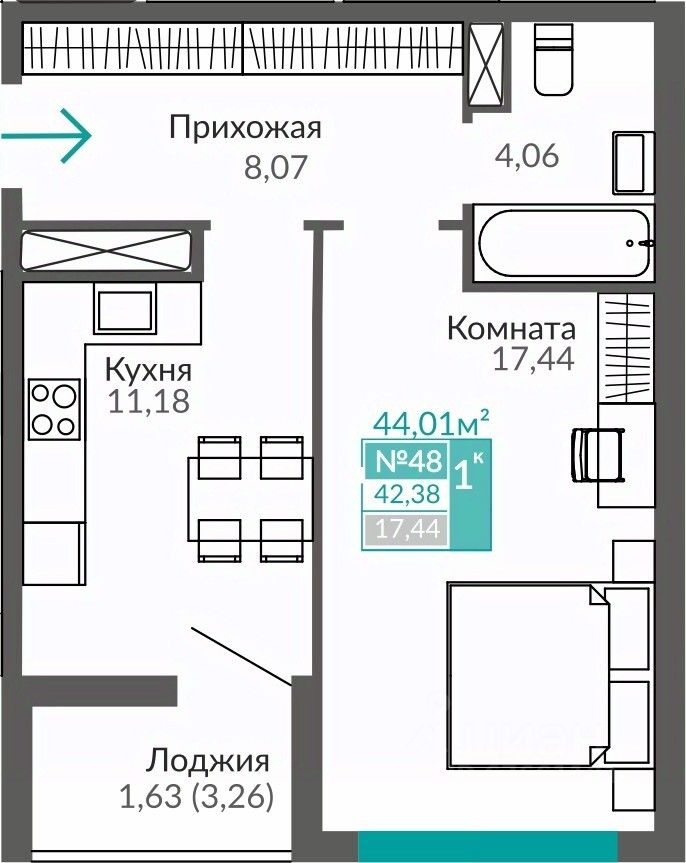 Продаётся 1-комнатная квартира в строящемся доме (С7), срок сдачи: III-кв. 2027, общей площадью 42.38 кв.м., на 7 этаже. Жилой квартал "Абрикос" - начало яркой истории жизни в прогрессивном районе Симферополя - Семья городских кварталов "Крымская Роза".
