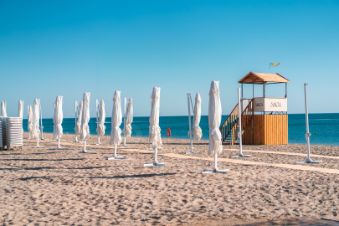 Инфраструктура: пляж — 1 минута , бассейн с детской зоной и гидромассажем , ресторан и деткафе , тренажёрный зал, детплощадка, закрытая территория без машин, видеонаблюдение, смарткарты. Курорт САГА — западное побережье Крыма, на косе между Чёрным морем и розовым озером Сасык-Сиваш: чистый воздух и красивые закаты.