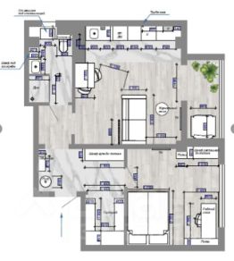 Общая площадь 56,2 м2, спальня 16 м2, кухня-студия 20 м2, гардеробная 4м2, лоджия 4,3 м2, 5эт/11эт. дома, высота потолков 3 м, дом одно подъездный, два лифта.
