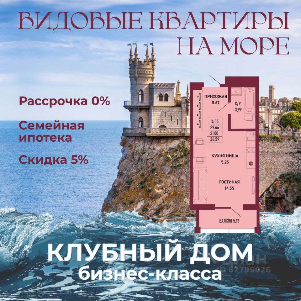 ЗВОНИТЕ ПРЯМО СЕЙЧАС, ЧТОБЫ ЗАБРОНИРОВАТЬ ЛУЧШУЮ КВАРТИРУ! Цена указана со скидкой 5% при условии 100% оплаты либо ипотека. - 80% ВИДОВЫХ КВАРТИРА НА МОРЕ ИЛИ ГОРЫ - Рассрочка 0% - Ипотека от СБЕРБАНКА - Доходность инвестиций от 40% годовых. - Безопасная сделка по ФЗ-214/эскроу-счёта Клубный дом "Ялта" — это воплощение изысканной жизни, где гармонично сочетаются статусность бизнес-класса, уют курортного отдыха и передовые технологии для комфортного проживания. Этот жилой комплекс создан для тех, кто ценит безупречное качество, безопасность и эстетику в каждой детали. Архитектура и дизайн * Современное монолитное 16-этажное здание * Фасады благородных оттенков: чистый белый, переливы шампань и тёплое золото * Первые этажи комплекса представлены в отделке рустовым камнем * Авторские интерьеры мест общего пользования * В темное время суток здания подчёркивает подсветка Характеристики квартиры и мест общего пользования * 80% лотов — с панорамными видами на море и горы. * Просторные балконы * Вместительные гардеробные и кухни-гостиные * Высокие потолки квартир 2,8 м Инфраструктура для комфортной жизни * Инфинити-бассейн * Ландшафтный дизайн и озеленение придомовой территории комплекса * Скоростные грузопассажирские лифты, соответствующие стандартам 5*-отелей, с прямым доступом в паркинг. * Кафетерий и магазин у дома * Детский веревочный комплекс "Парк-Маугли" * Скалодром * Финская сауна, хамам * На 1 этаже жилого комплекса - лапомойка и гостевой туалет Безопасность и технологии спокойствия * Закрытая территория, контролируемый доступ * Видеонаблюдение по всему периметру комплекса * Электронные домофоны с индивидуальными ключами с доступом * Безбарьерная среда * Подземный паркинг * Келлеры * Зоны хранения для велосипедов, самокатов и колясок * Мотоместа Коммуникации и инженерия * Автономная газовая котельная на крыше * Телеметрия * Класс энергоэффективности жилого комплекса "А+" * Места для кондиционеров и практическое решение для маскировки коммуникаций Расположение и ближайшие пляжи * 2,9 км до моря 10 мин на машине * 2 км от центра Ялты * Пляж Приморский — 30 мин пешком / 10 мин на авто * Пляж Массандровский — 20 мин на машине