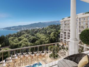 В комплексе — 207 просторных апартаментов, включая 13 пентхаусов с террасами площадью от 150 до 300 м². С каждой террасы открываются панорамные виды на Ялтинскую бухту, Никитский ботанический сад и горы Ялты — вид, от которого захватывает дух!