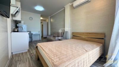 Выполнен качественный свежий ремонт, установлена вся необходимая бытовая техника и мебель. Пространство продумано до мелочей: функционально объединены зоны кухни, спальни и гостиной, предусмотрены системы хранения.