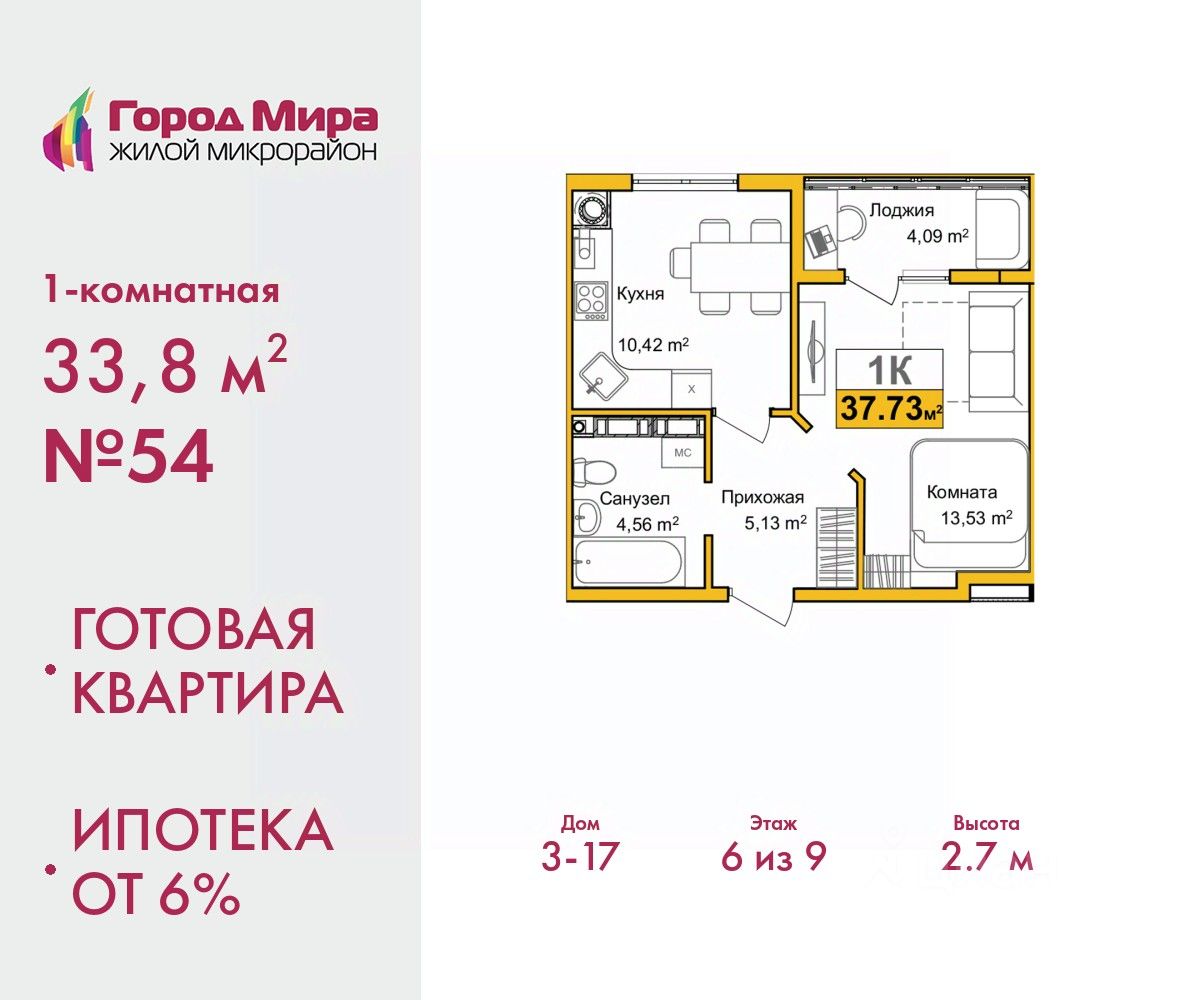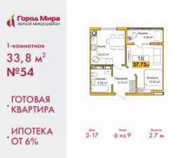 1-комн. квартира с предчистовой отделкой в ЖМ "Город Мира" на 6 этаже. Общая площадь: 33.8 кв.м. Высота потолков 2.7 м.