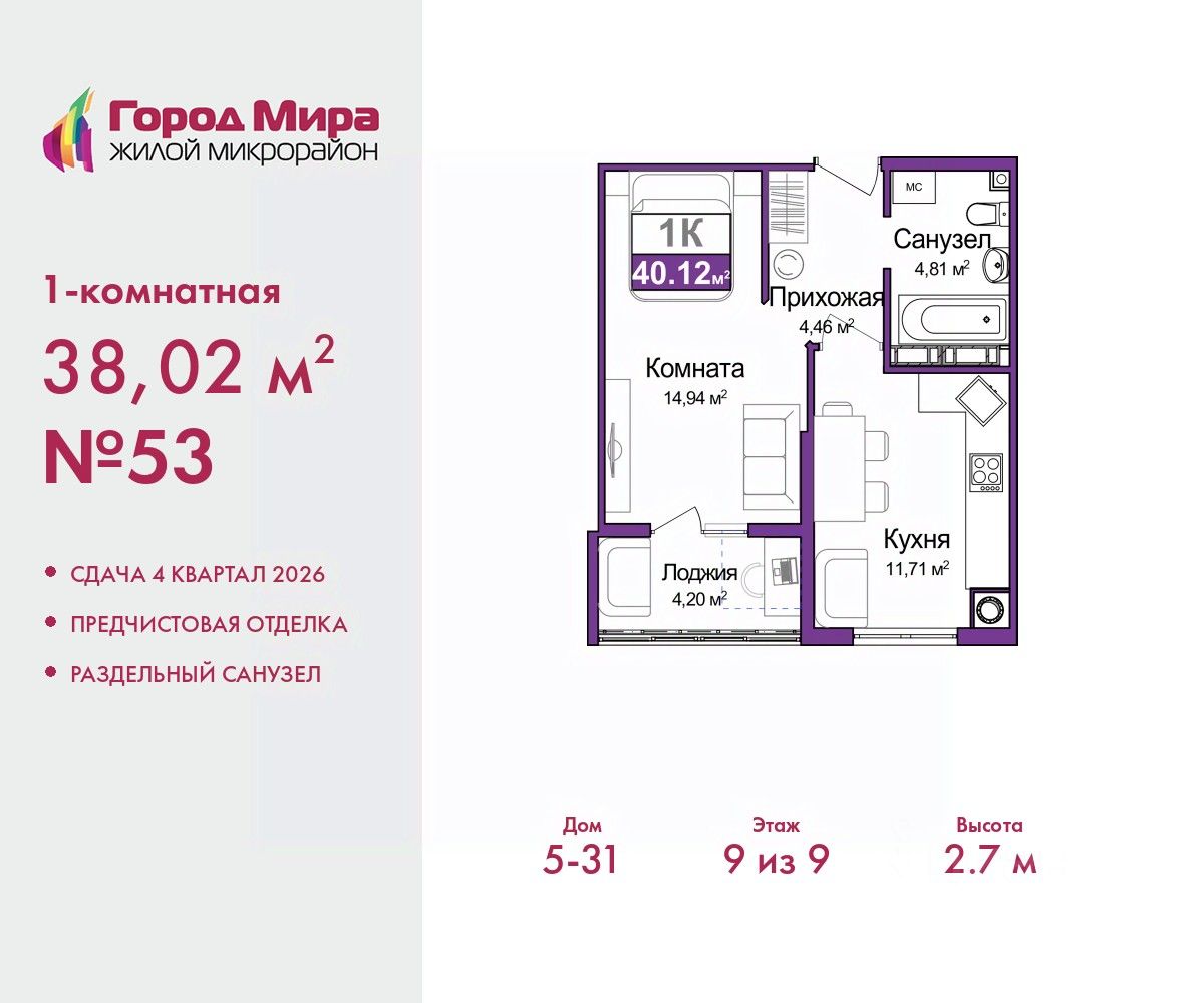 Просторная 1-комн. квартира с предчистовой отделкой в ЖМ "Город Мира" на 9 этаже. Общая площадь: 38.02 кв.м. Высота потолков 2.7 м.