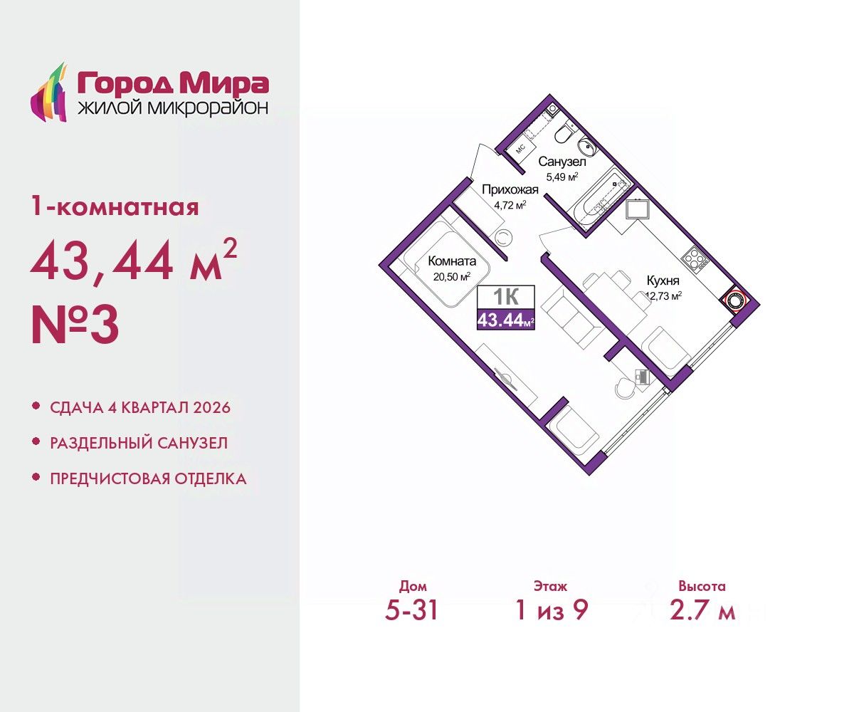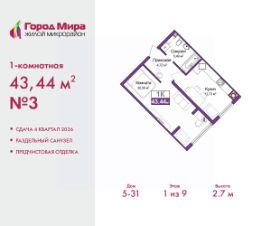 Продается 1-комн. квартира с предчистовой отделкой в ЖМ "Город Мира" на 1 этаже. Общая площадь: 43.44 кв.м., жилая: 20.5 кв.м., площадь просторной кухни-столовой: 12.73 кв.м. Все окна выходят на одну сторону. В квартире один совмещенный санузел. Высота потолков 2.7 м.