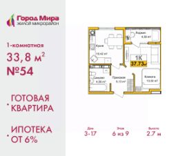 1-комн. квартира от застройщика с предчистовой отделкой в ЖМ "Город Мира" на 6 этаже. Общая площадь: 33.8 кв.м. Высота потолков 2.7 м.