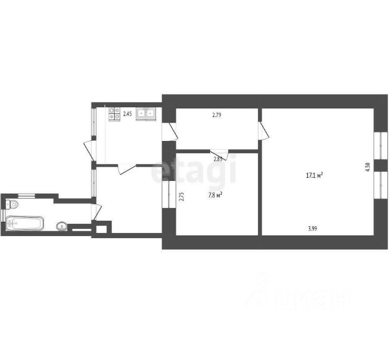Общая площадь квартиры составляет 42,8 квадратных метра.