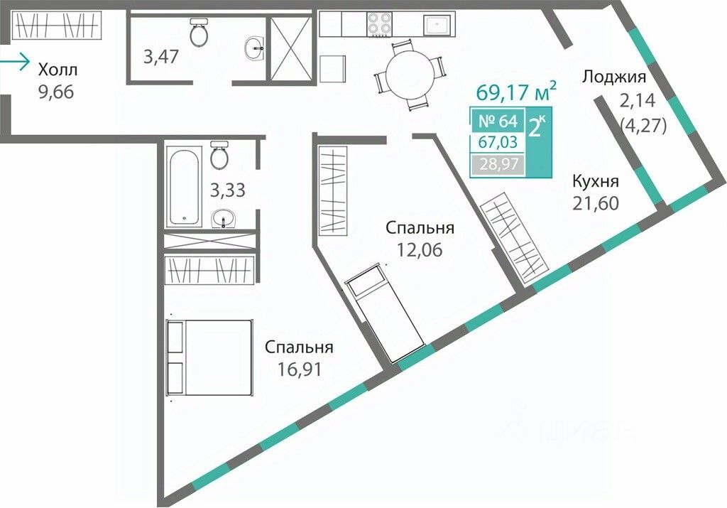 Продаётся 2-комнатная квартира в строящемся доме (Дом 4 (Секция Т5)), срок сдачи: I-кв. 2029, общей площадью 67.03 кв.м., на 13 этаже. Новый жилой комплекс "Благо" от застройщика "Монолит" расположен по адресу: Республика Крым, Симферопольский район, село Перово