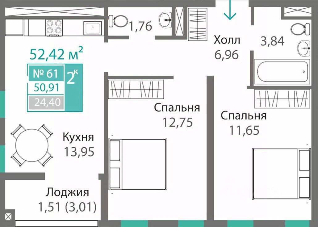 Продаётся 2-комнатная квартира в строящемся доме (Дом 3 (Секции Т3.3, К3КП2)), срок сдачи: I-кв. 2029, общей площадью 50.91 кв.м., на 9 этаже. Новый жилой комплекс "Благо" от застройщика "Монолит" расположен по адресу: Республика Крым, Симферопольский район, село Перово