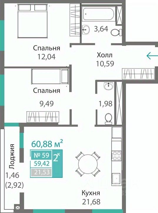Продаётся 2-комнатная квартира в строящемся доме (Дом 2 (Секции Т2.1, Т2, К3КП1)), срок сдачи: I-кв. 2029, общей площадью 59.42 кв.м., на 5 этаже. Новый жилой комплекс "Благо" от застройщика "Монолит" расположен по адресу: Республика Крым, Симферопольский район, село Перово