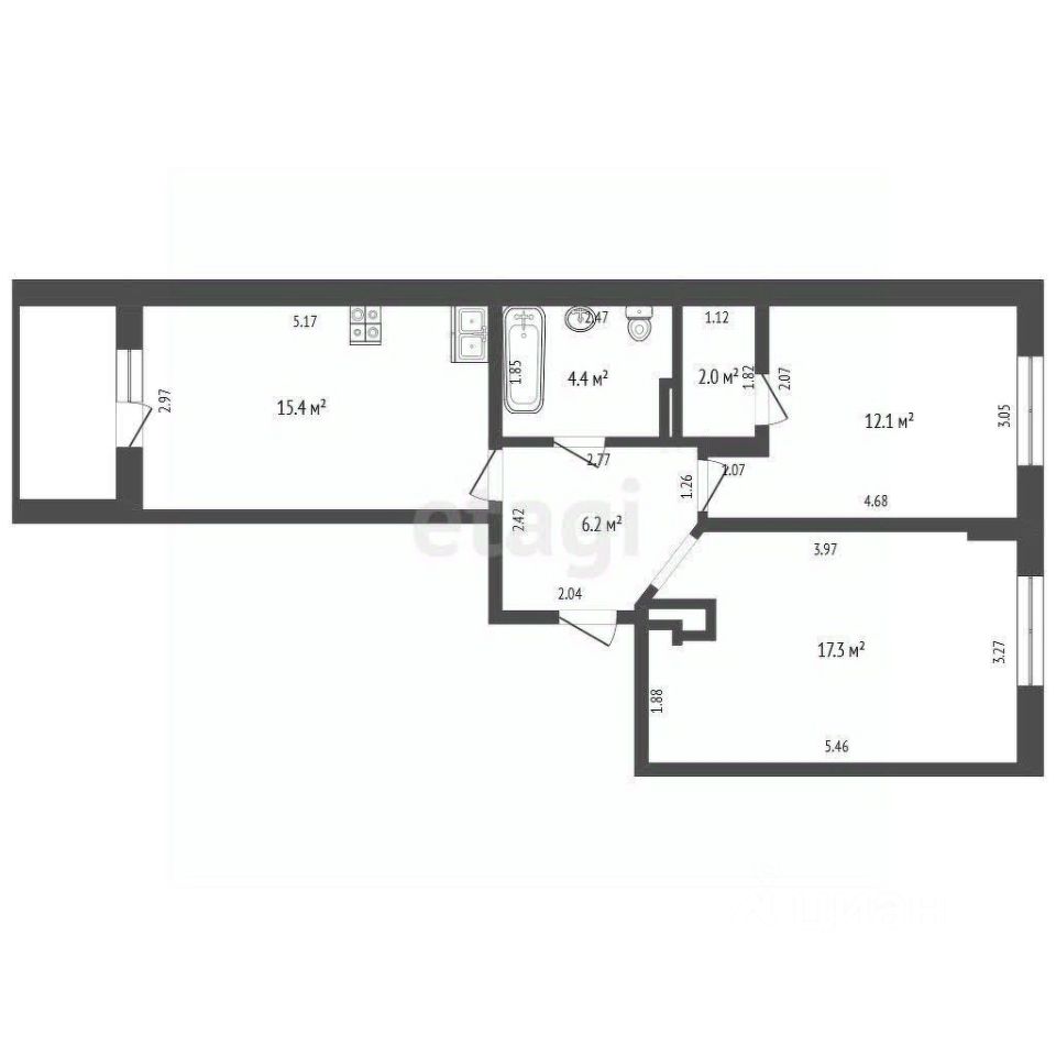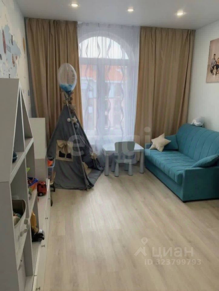 Квартира имеет изолированные комнаты: спальня и детская выходят во двор на восточную сторону, а кухня-гостиная с балконом — на аллею на запад. Общая площадь квартиры составляет 57.4 кв. м, жилая — 35 кв. м, кухня — 15.4 кв. м.