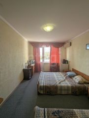 В студии выполнен современный ремонт. Есть три спальных места, тумбочки, платяной шкаф, кондиционер, холодильник, телевизор.